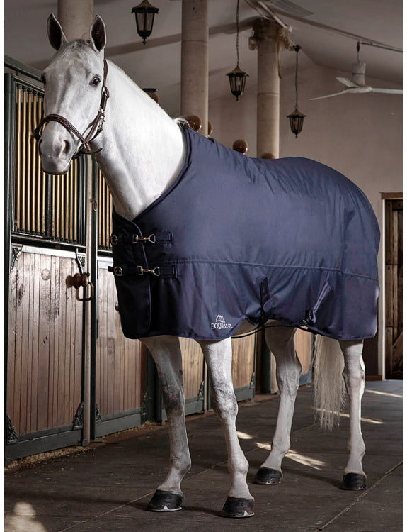 Coperta da box blu composta da tessuto esterno con poliestere antistrappo 1200 denari. Fodera interna in tessuto di cotone svizzero e poliestere anallergico e antibatterico. Imbottito con 200gr di ovatta traspirante. Chiusura frontale regolabile per garantire la perfetta vestibilità su ogni cavallo. Logo Equiline bianco stampato sul davanti.
