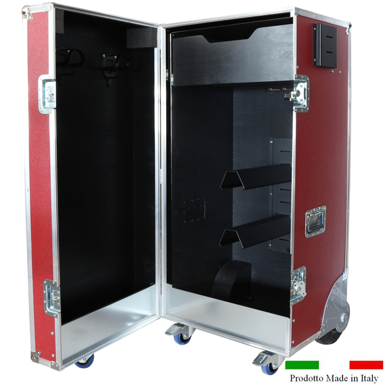Baule da concorso SARTORE per 2 selle. Rivestito esternamente in laminato plastico. Ruote pneumatiche da 260mm su flange in ABS applicate a filo baule.