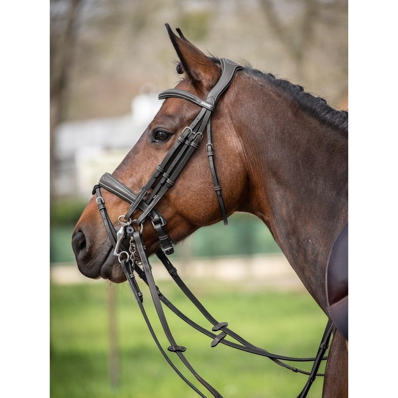 Il frontalino e la capezzina sono impunturati e hanno un ricamo fantasioso. A parte i montanti, tutte le altre parti della briglia sono rivestite in pelle traforata per una migliore traspirabilità. Il chiudibocca è rimovibile e il sovraccapo è anatomico per offrire maggiore comfort al cavallo. La briglia Megève viene venduta con due paia di redini.