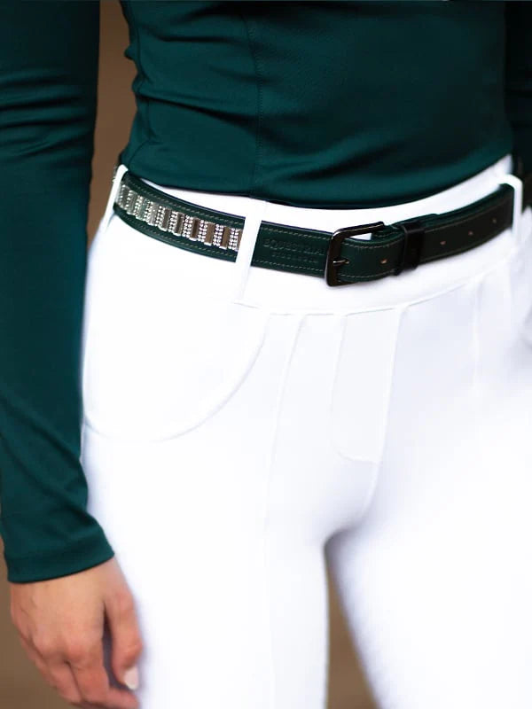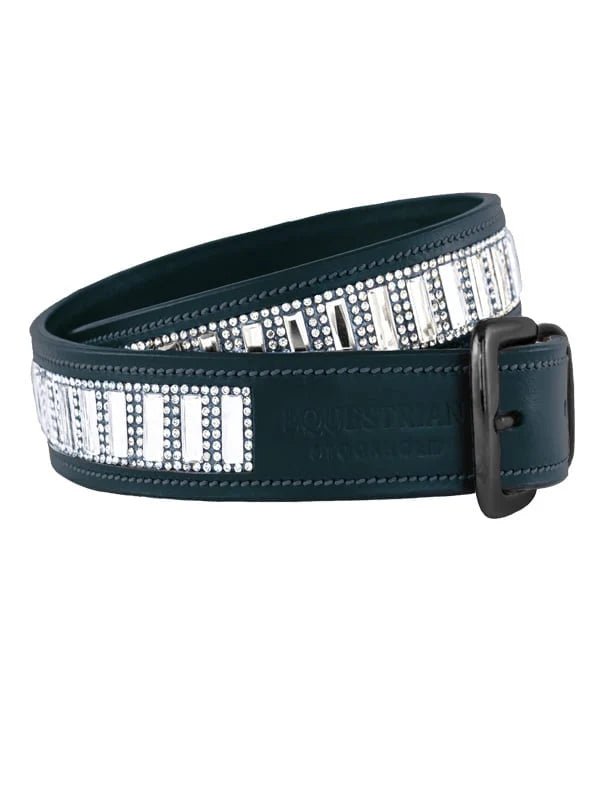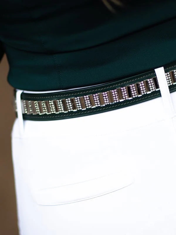 Una cintura che ti fa brillare come una vincitrice! Creata al 100% in pelle di bufalo di alta qualità e con un processo di tintura sostenibile, dove non vengono utilizzate sostanze chimiche. Bellissima pelle verde drammatica con il logo ES inciso, cristalli trasparenti e fibbia nera.