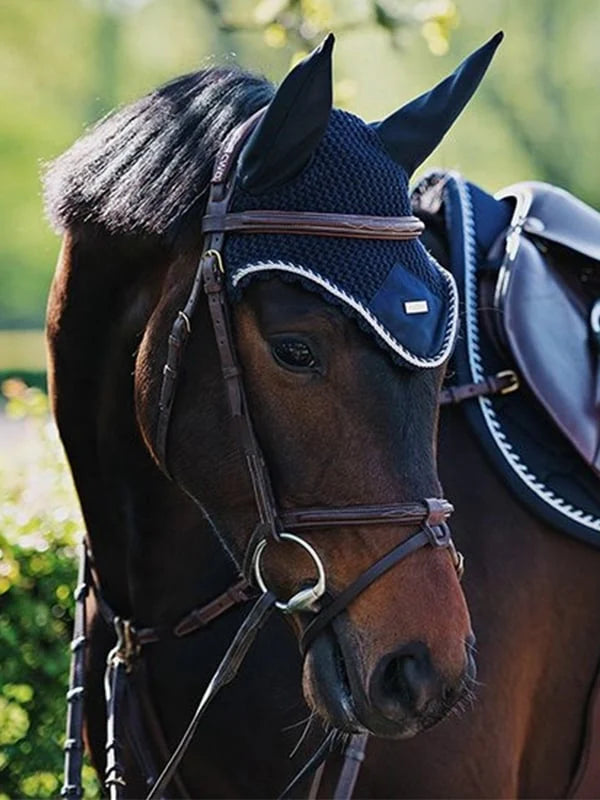 Lussuosa cuffia in blu navy con dettagli argentati. La cuffietta aiuta sia con la protezione contro gli insetti che con la riduzione del rumore.