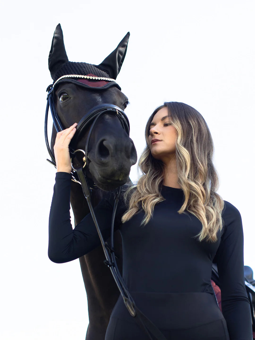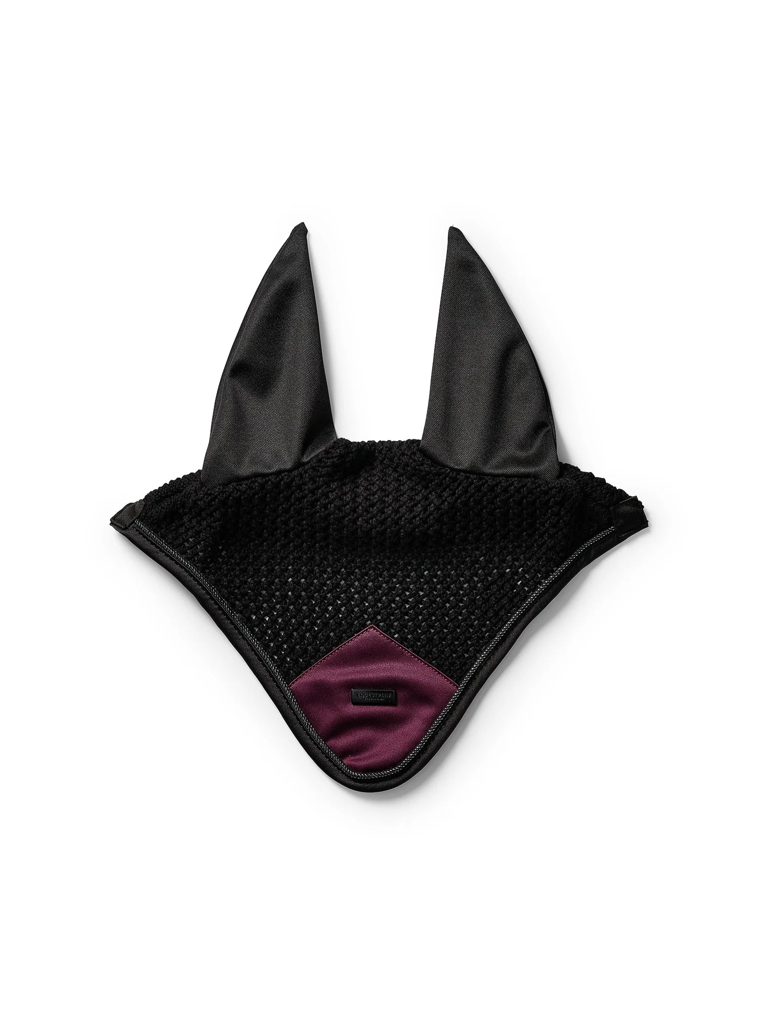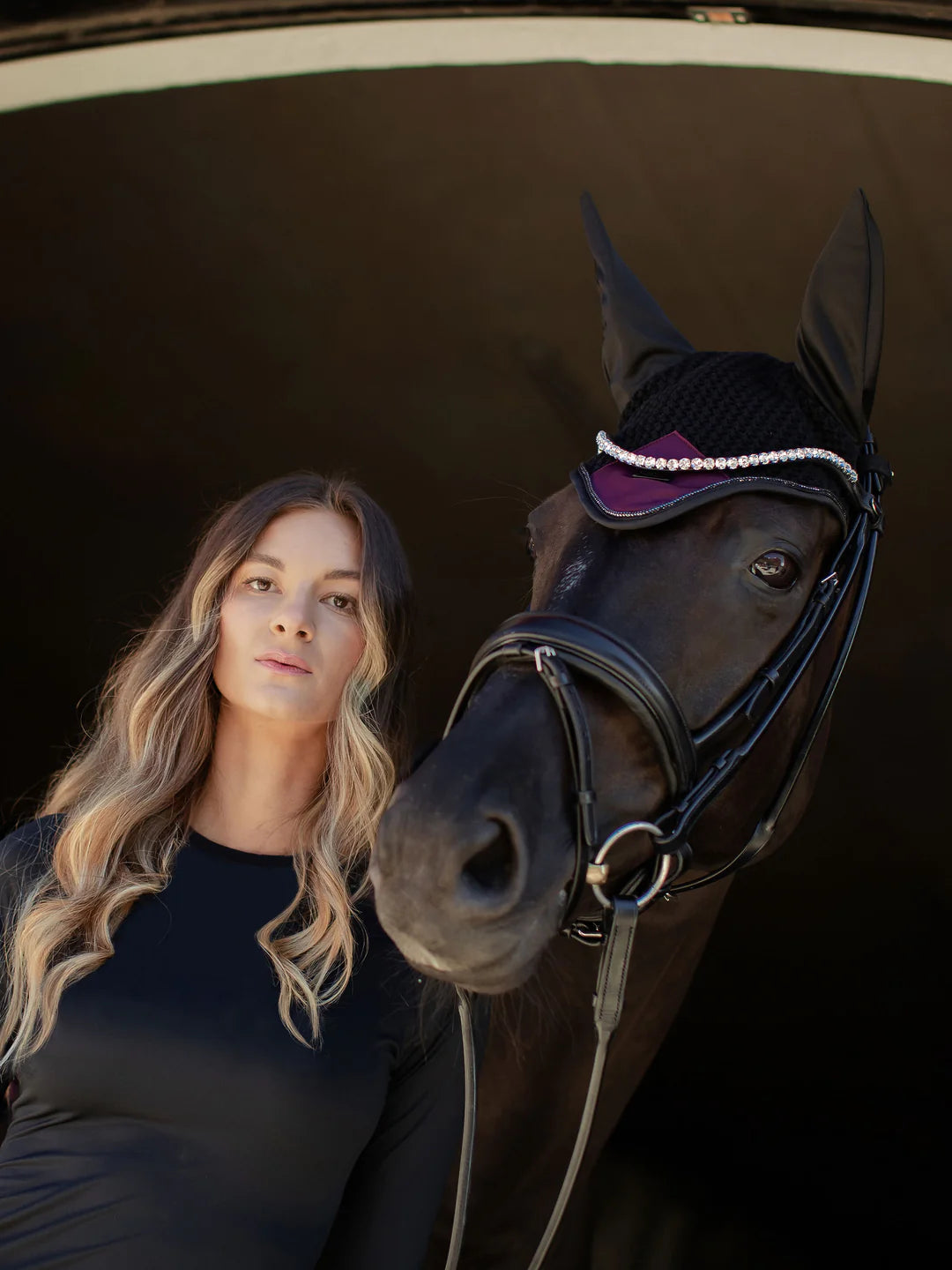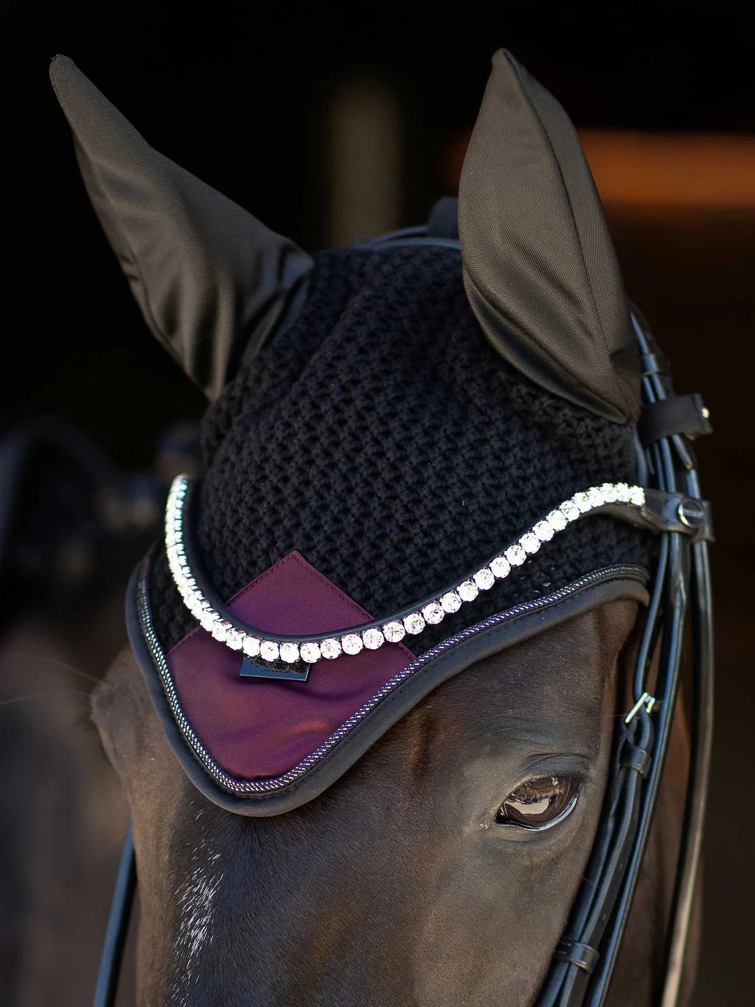 Lussuosa cuffia per le orecchie all'uncinetto in colore nero. Decorato con una toppa di raso viola scuro sul davanti, bellissimi profili argentati e uno stemma di Equestrian Stockholm in nero. La cuffietta fornisce sia protezione dagli insetti che riduzione del rumore. Ha un panno elastico sulle orecchie per un maggiore comfort.