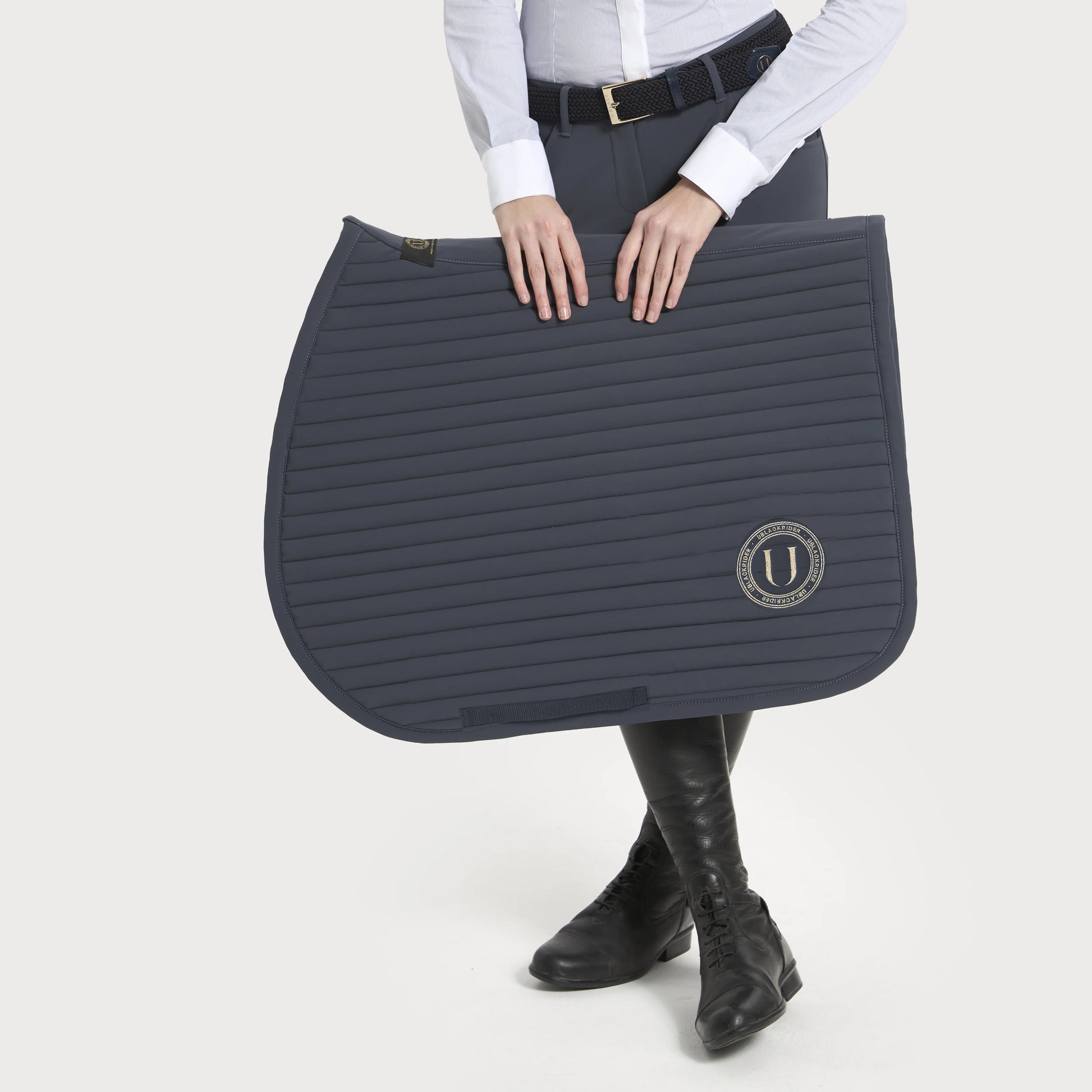 Elegante sottosella in tessuto tecnico grigio, trapuntato a riga e impreziosito dal logo ricamato con filo dorato. Interno in cotone nido d'ape. Questo sottosella non solo offre comfort e traspirabilità superiori per il tuo cavallo, ma aggiunge anche un tocco di lusso e stile. Perfetto per le competizioni e gli allenamenti quotidiani.