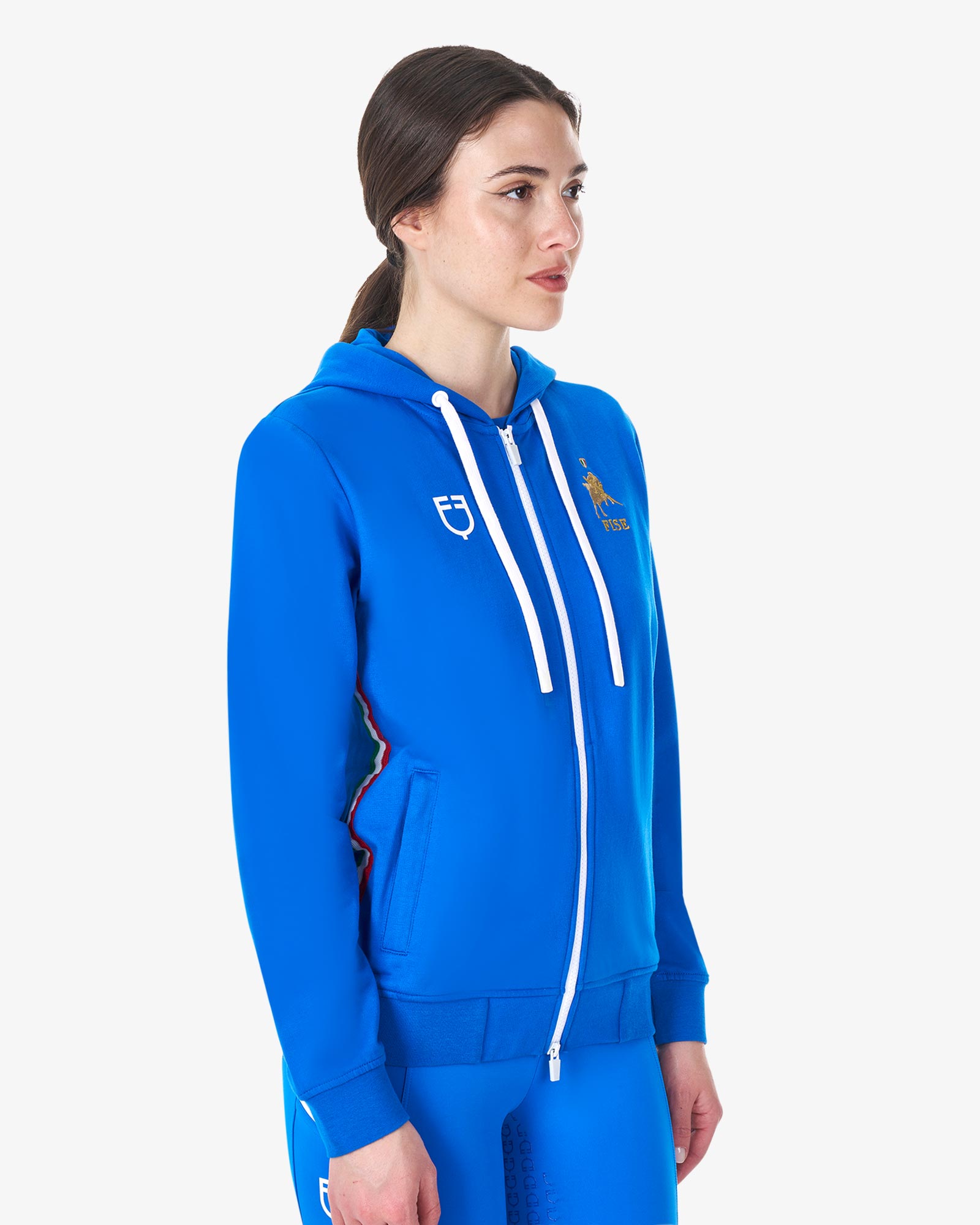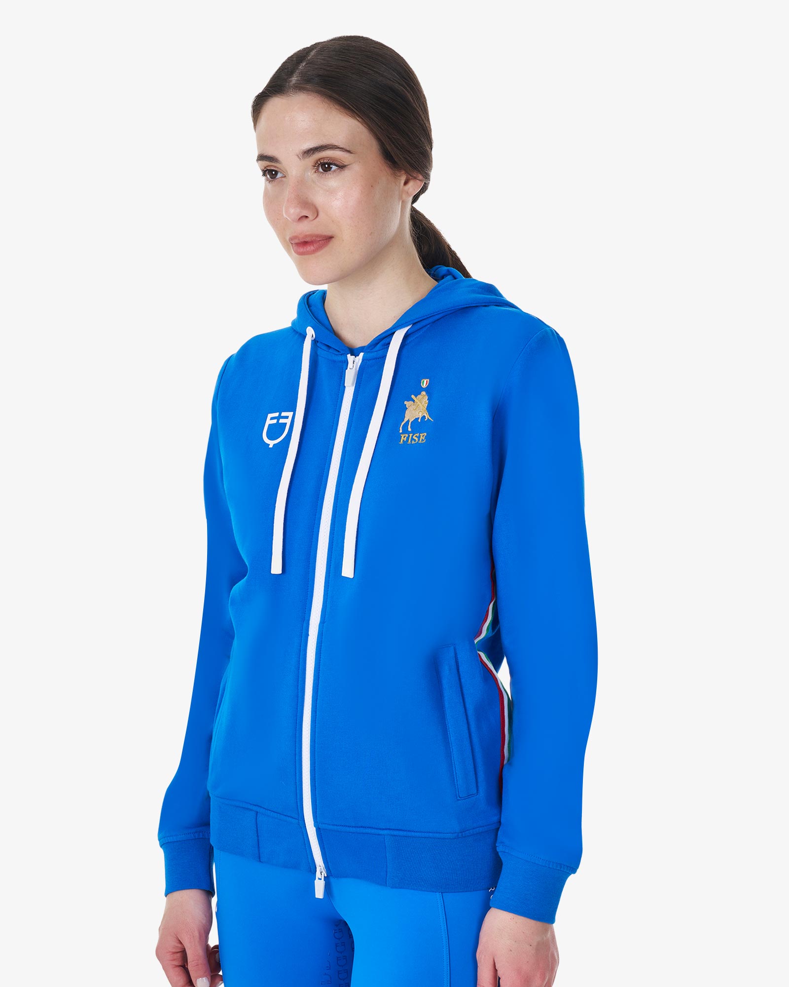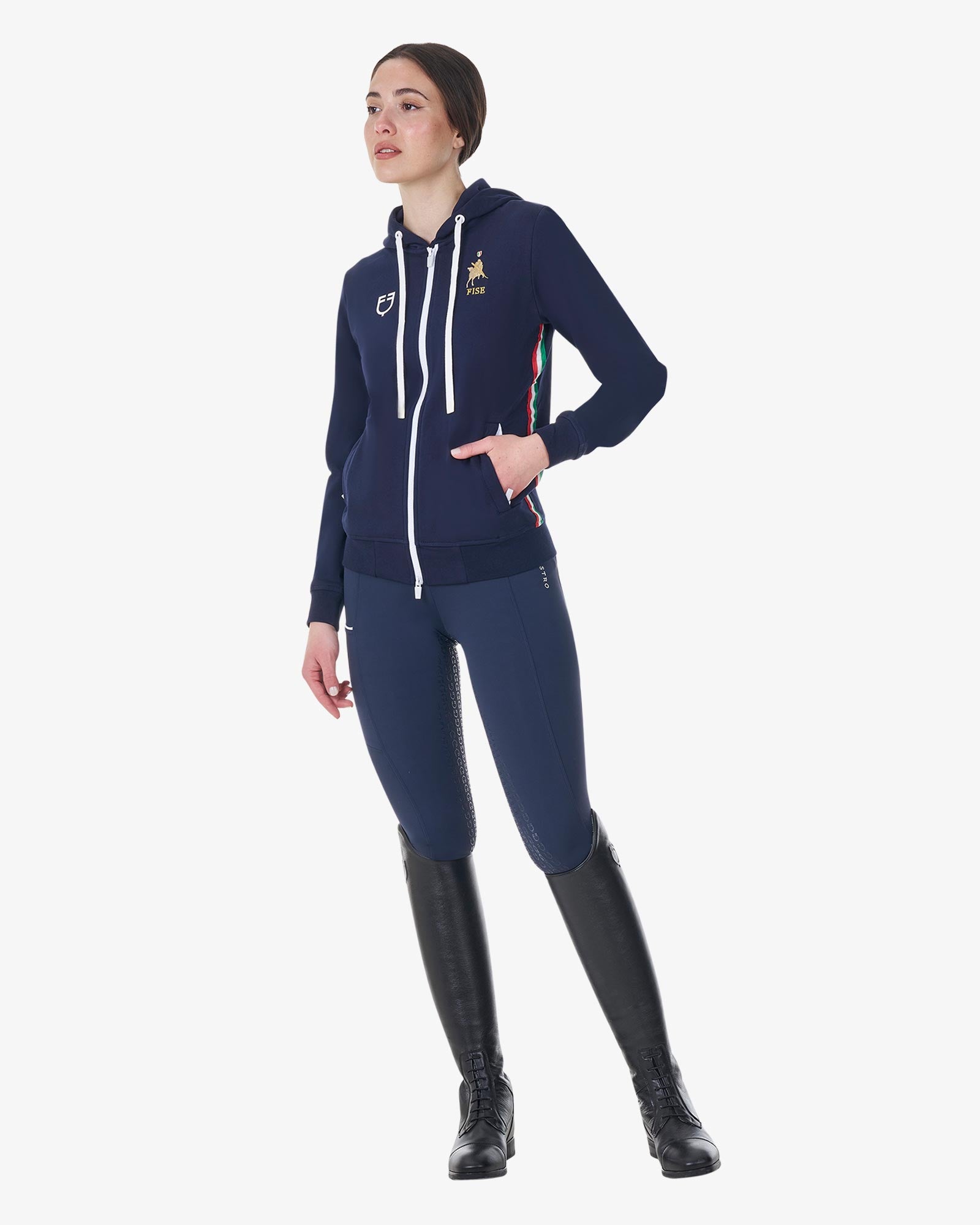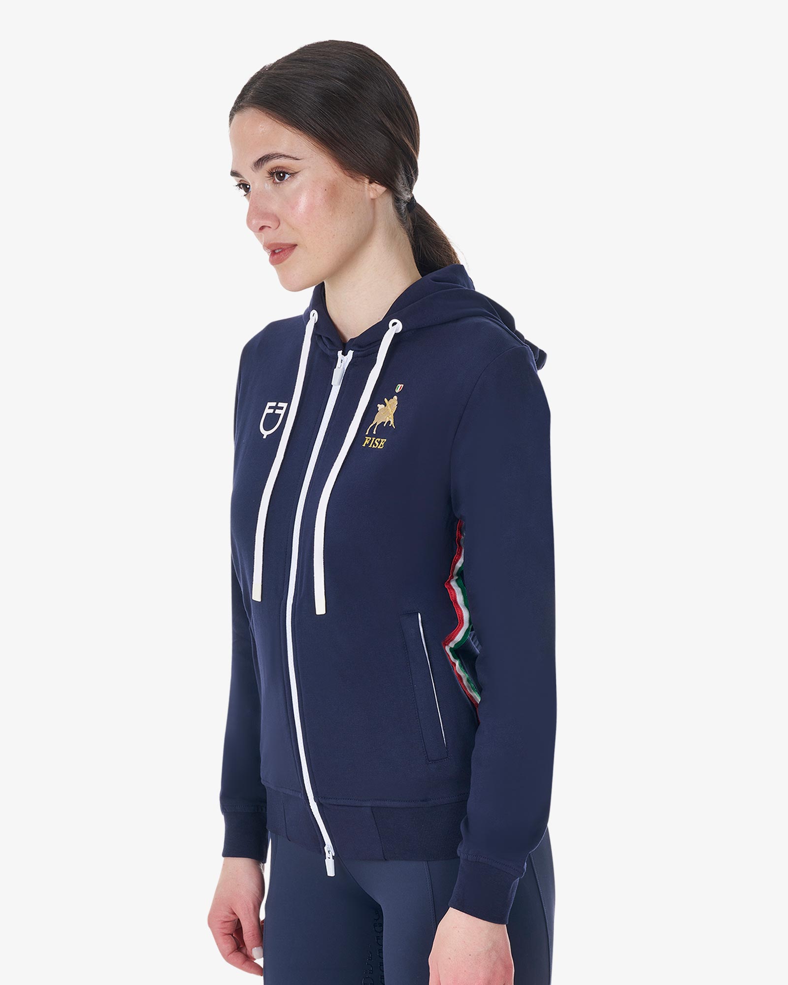 Felpa donna Equestro X FISE realizzata in morbido cotone con pratica zip frontale antivento e cappuccio regolabile, per offrire al cavaliere un'impareggiabile comfort.