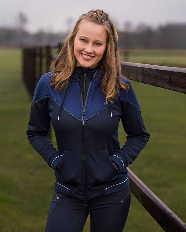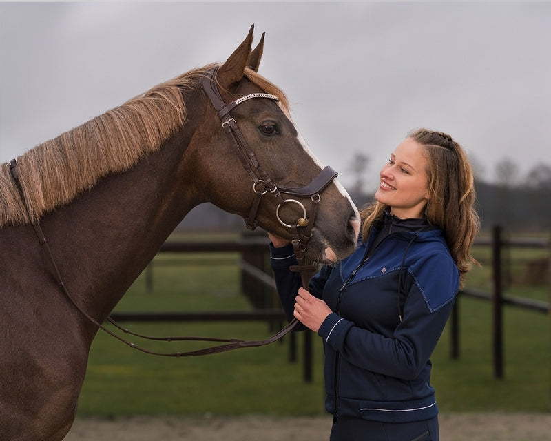 Questa felpa Sienna è un must have per il prossimo inverno. Ti terrà al caldo durante le giornate più fredde grazie alla morbida fodera in pile. La felpa Sienna è realizzata in materiale elastico in modo da poterla indossare comodamente e avere tutta la libertà di movimento. Presenta una comoda chiusura a zip ed è rifinita con una fascia con la scritta "EQUESTRIAN SPORTS". Il cappuccio può essere facilmente fissato per mezzo di un bottone a pressione.