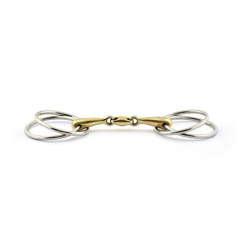 Questo filetto spezzato in tre serve a rilasciare la pressione sul palato. I due anelli liberi sono fissati ai montanti e i due anelli del barilotto sono fissati alle redini.
