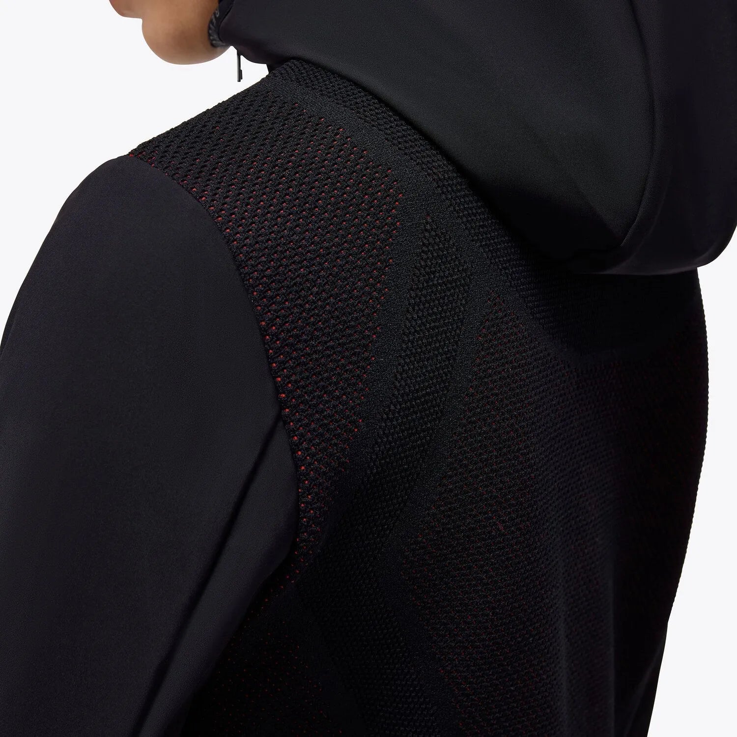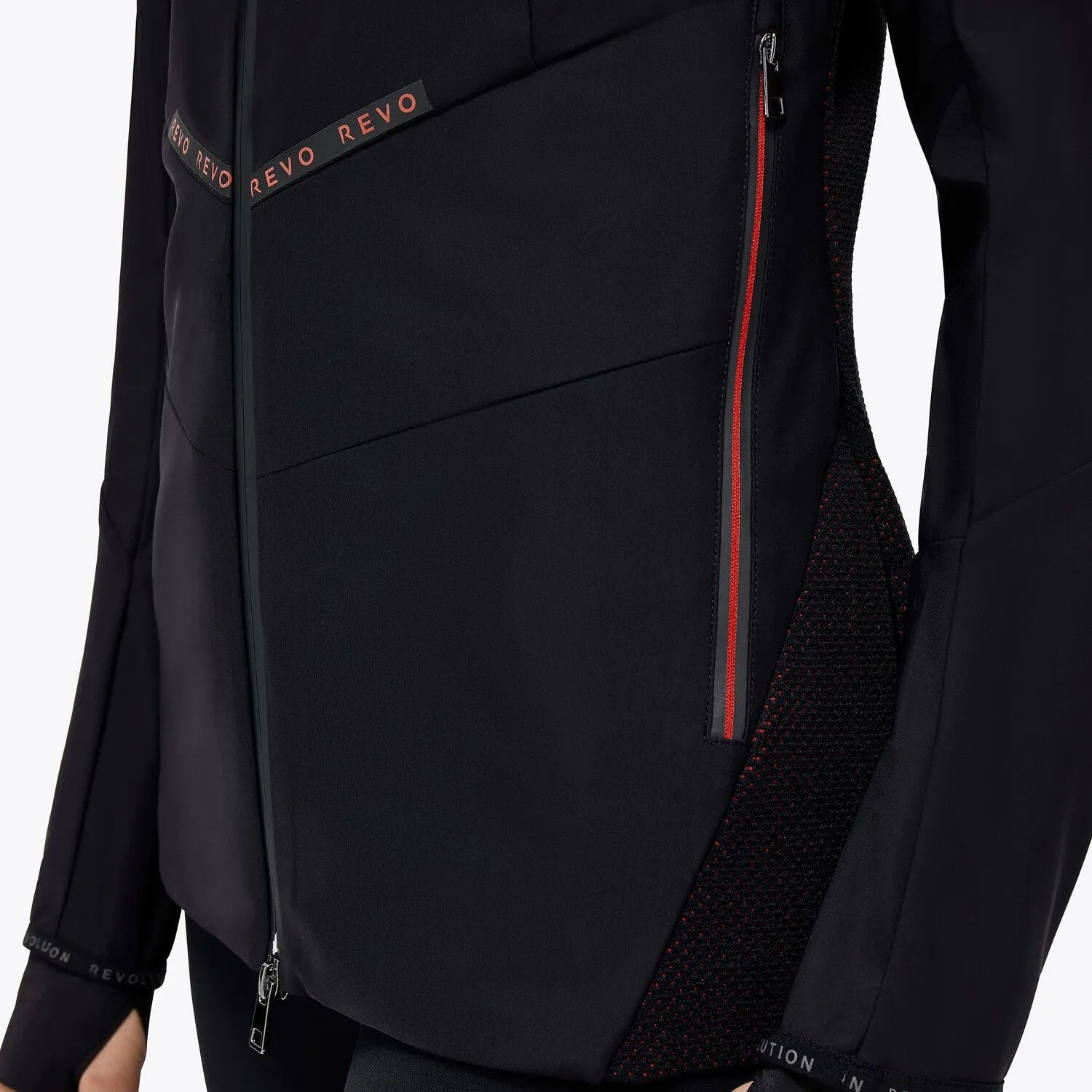 Una giacca tecnica e performante progettata per le attività all'aria aperta e l'equitazione. Il modello è realizzato in softshell REVO e presenta una membrana interna traspirante, impermeabile e antivento con retro in maglia tecnica. Le maniche lunghe con fori per i pollici proteggono le mani, mentre il colletto, le tasche, gli spacchetti laterali e la chiusura sono rifiniti con cerniere termonastrate per un ulteriore isolamento. Il bordo del logo e il lettering sul davanti conferiscono una forte finitura grafica.