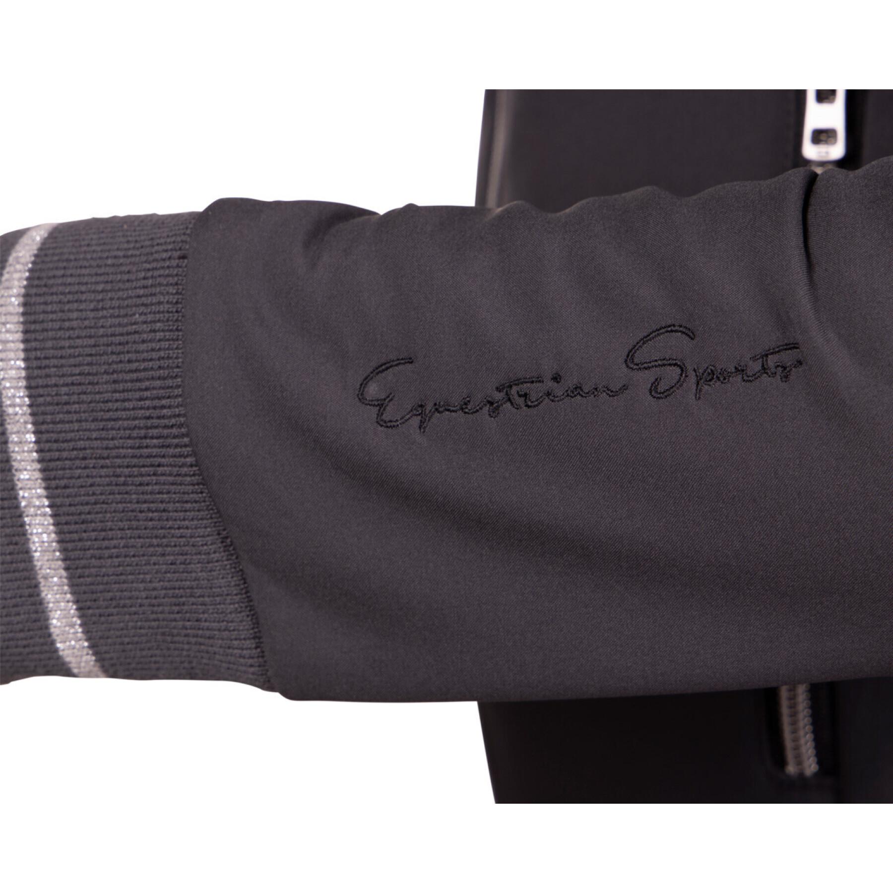 Giacca sartoriale in materiale softshell leggero con dettagli argento. L'interno della giacca è realizzato in pile, il che rende questa giacca ideale per le giornate estive più fresche. L'orlo e le maniche hanno una fascia elastica, che rende la giacca ben aderente. C'è una striscia argentata attraverso l'elastico che si abbina alle cerniere e ai ricami color argento. La giacca è idrorepellente, traspirante e antivento. La manica sinistra è decorata con un ricamo argentato "Equestrian Sports", mentre sul petto a sinistra c'è un badge QHP in metallo.