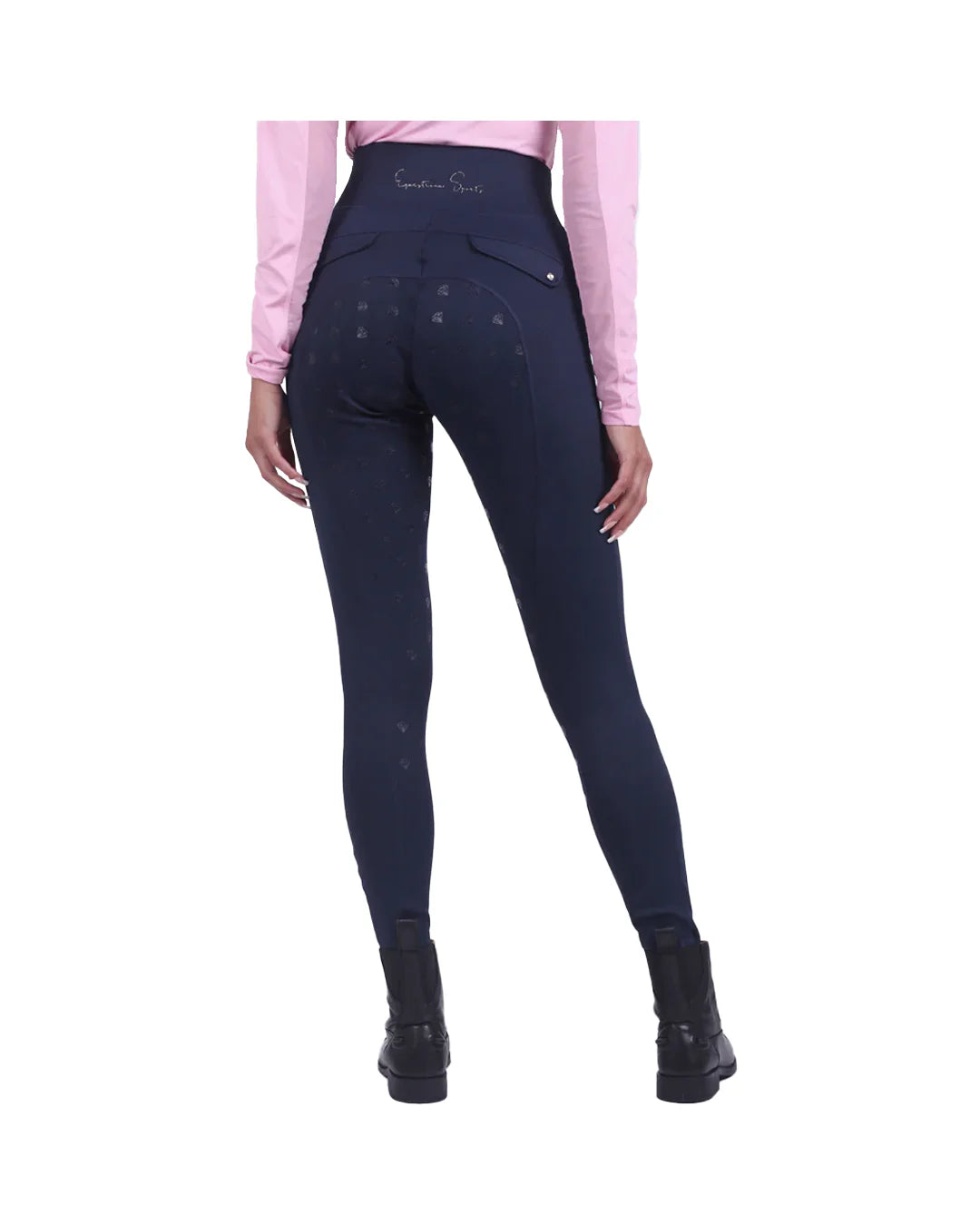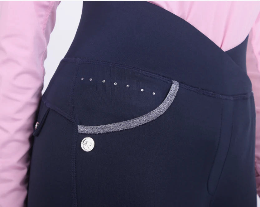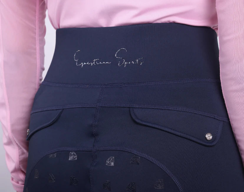 I leggings QHP Kathleen Full Grip hanno un look elegante grazie alla vita alta incrociata, ai dettagli a rombi e al ricamo color argento lungo le tasche anteriori. Il tessuto è molto elastico, traspirante e fornisce una sensazione di benessere e comfort. Le finte tasche e la stampa glitter "Equestrian Sports" sul retro completano il look di questo fantastico leggings.