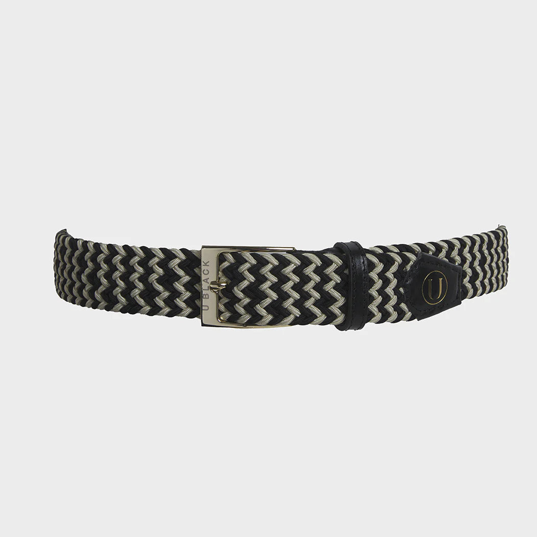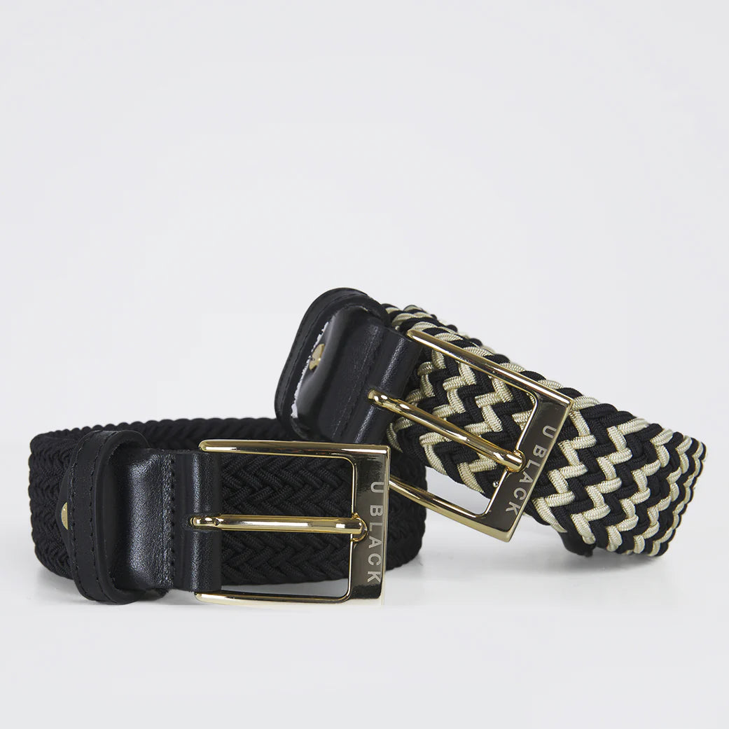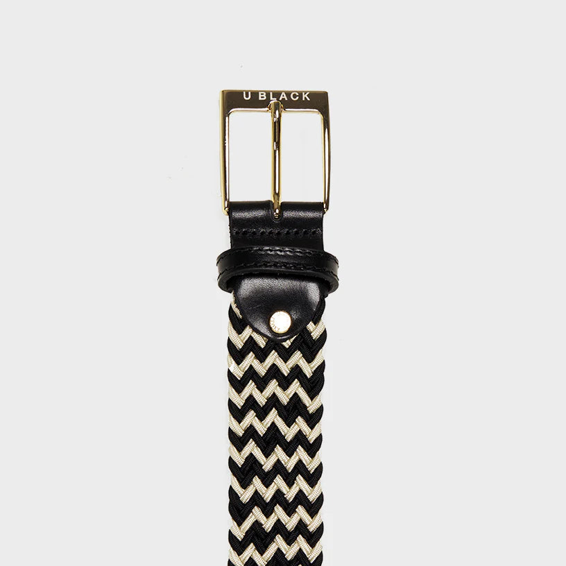 Cintura unisex in elastico intrecciato bicolor, fibbia in metallo zincato dorata con marchio lettering U BLACK e terminali in pelle con marchio dorato.
