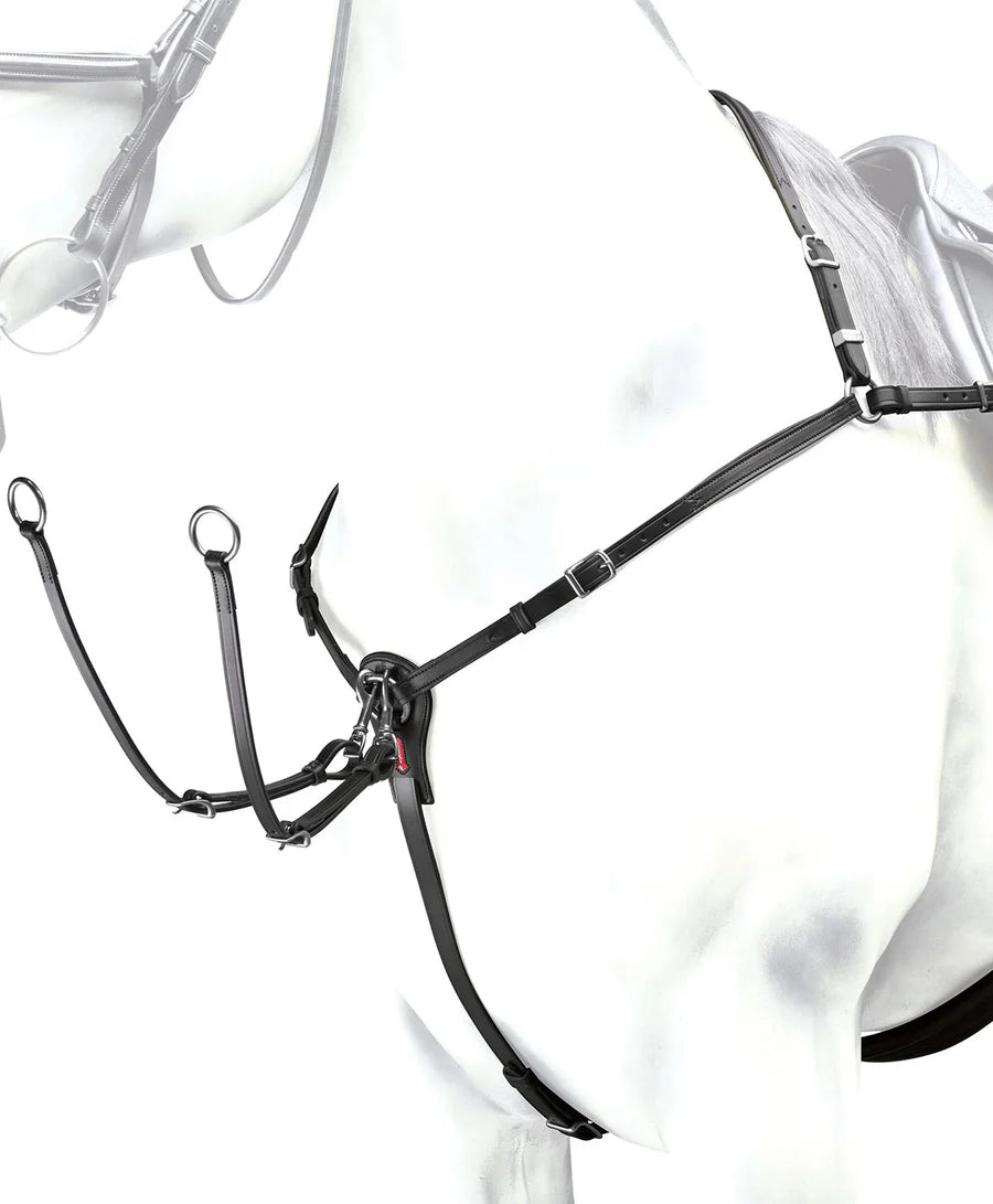 Martingala da caccia con forchetta removibile, realizzata in cuoio naturale, con fibbie/finiture in ottone e acciaio. Dotata di doppia regolazione per adattarsi al meglio a ogni esigenza, con attacco sui riscontri.