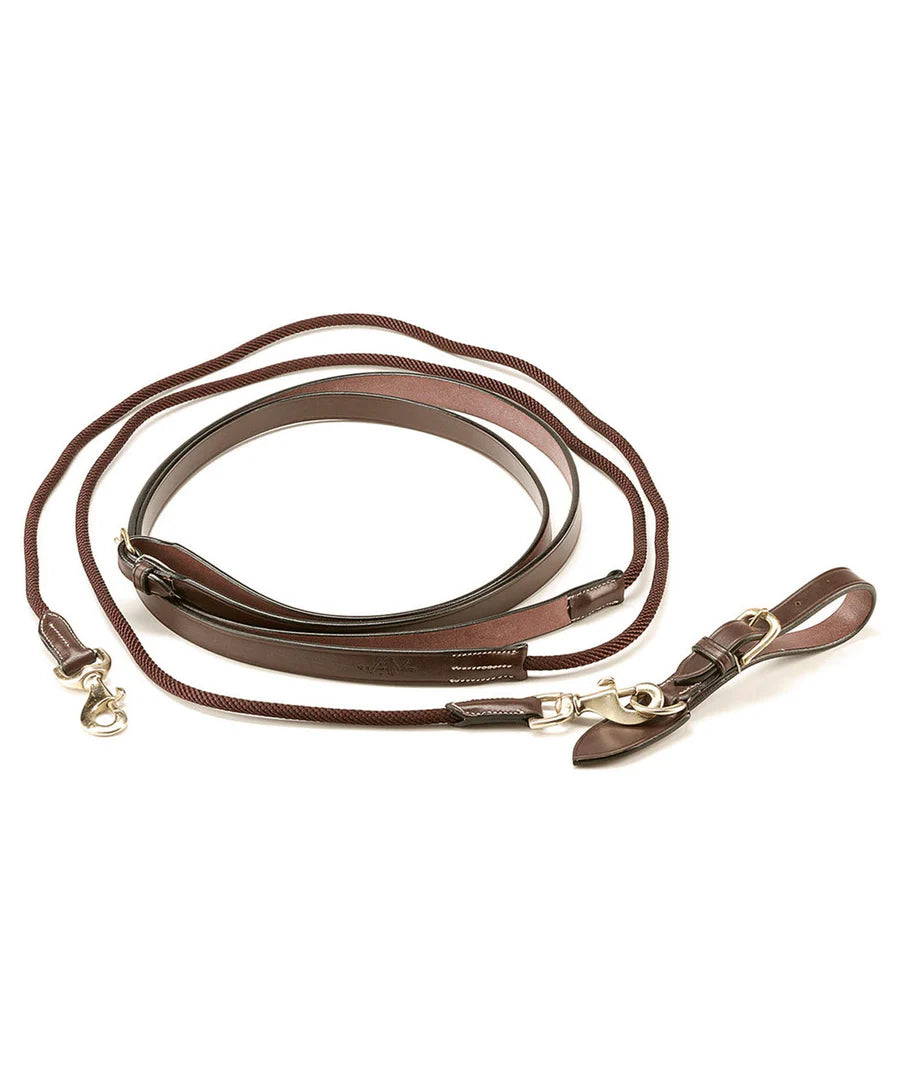 Redini di ritorno da salto realizzate in cuoio naturale e cotone. Particolarmente resistenti, assicurano una presa decisa ed efficiente. Dotate di moschettone a farfalla per il sottopancia e fibbie/finiture in ottone.
