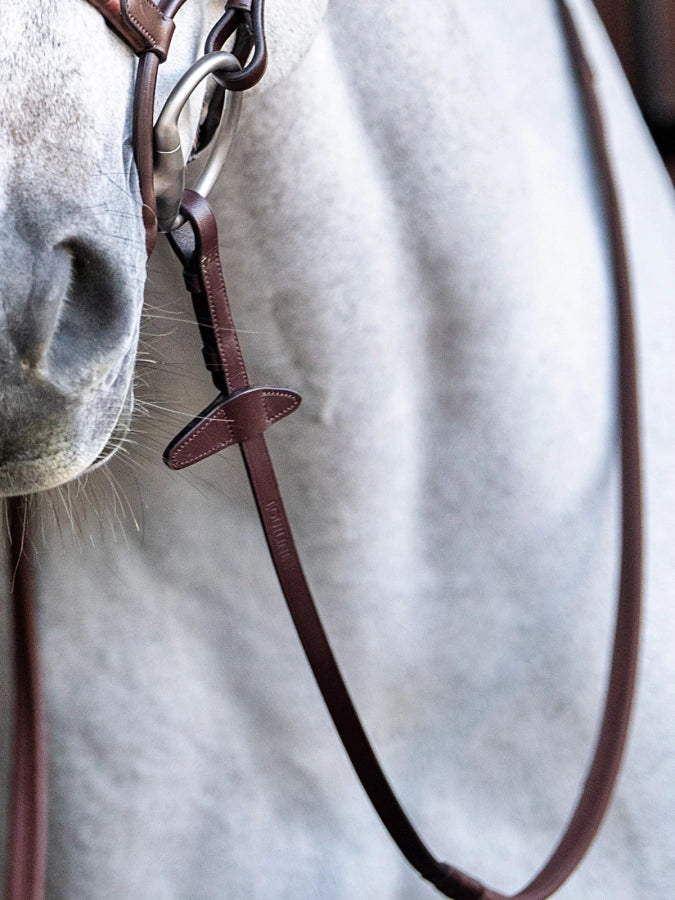 Redini in pelle con impugnatura in gomma inserita in nylon con ferma martingala dal nuovo design e chiusura con gancio e perno. Larghezza 5/8" e lunghezza 58".