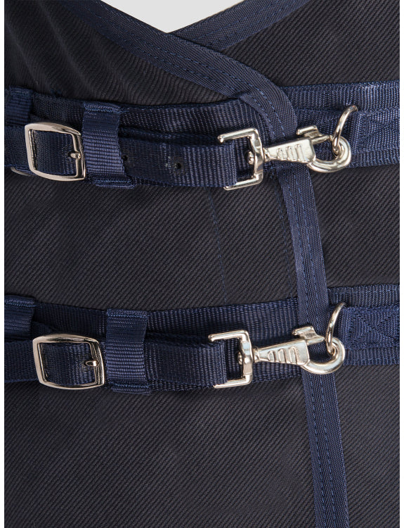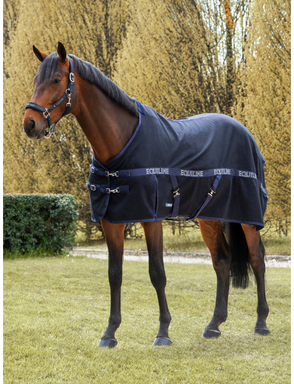 Coperta da box in robusto cotone traspirante e cinghie incrociate. Ideale anche come coperta da trasporto o come sottocoperta.