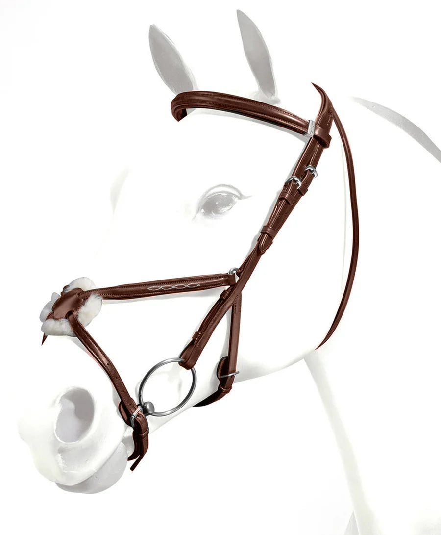 Testiera da salto in cuoio naturale, dotata di frontalino bombato e capezzina messicana con ricamo.