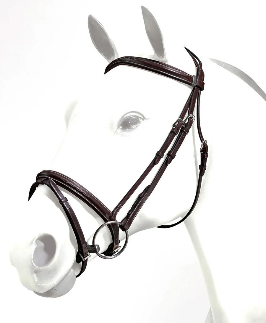 Testiera da salto in cuoio naturale, dotata di frontalino bombato e capezzina irlandese con ricamo. Linea Emporio.