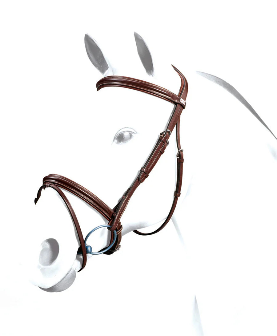 Testiera da salto con sopracapo anatomico “no stress” che rispetta la morfologia della testa del cavallo alleviando la pressione. Realizzata in cuoio naturale, è dotata di frontalino bombato per il massimo comfort e capezzina irlandese.