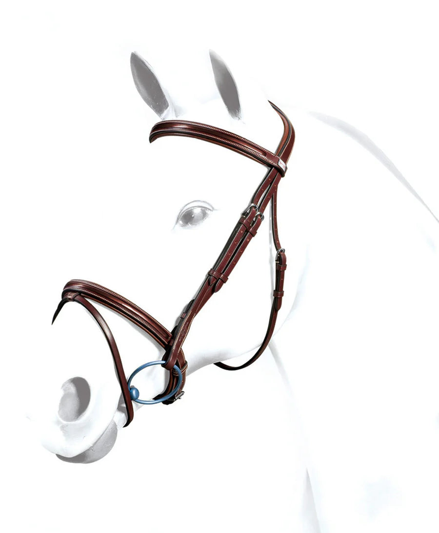Testiera da salto con sopracapo anatomico “no stress” che rispetta la morfologia della testa del cavallo alleviando la pressione. Realizzata in cuoio naturale, è dotata di frontalino, capezzina irlandese in vernice.