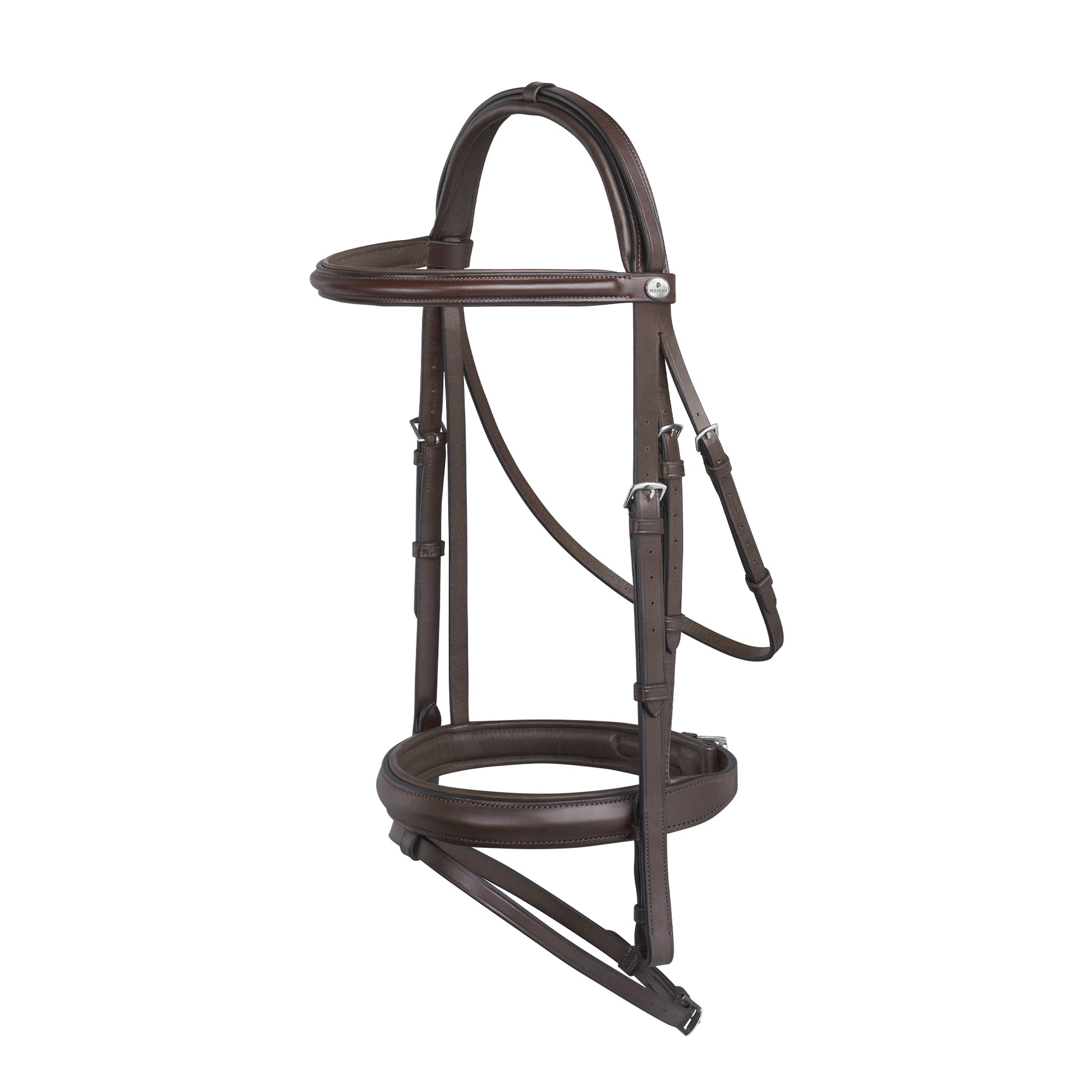Testiera inglese in cuoio con triplice bombatura. La capezzina scorre nel sopratesta e ha la possibilità di essere regolata su entrambi i lati.