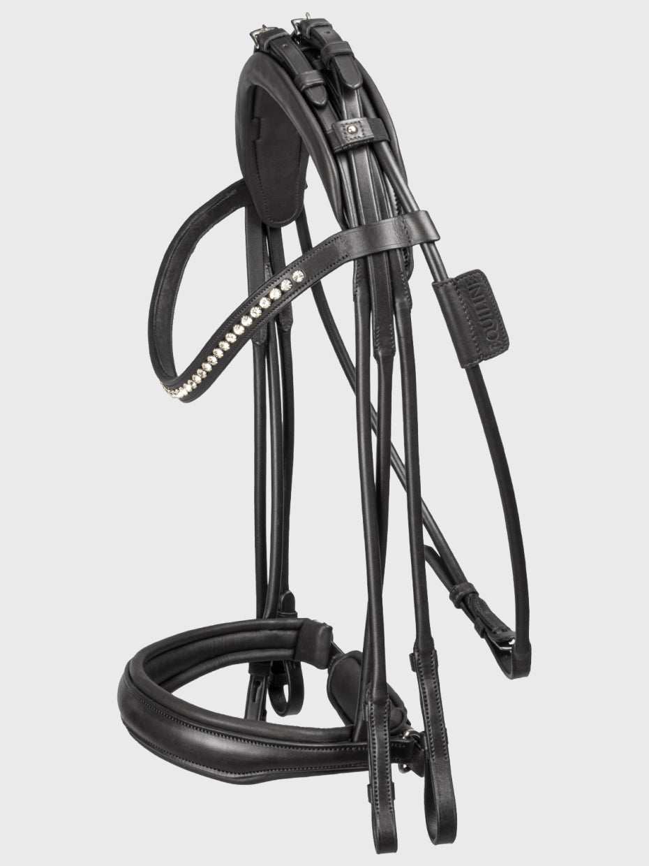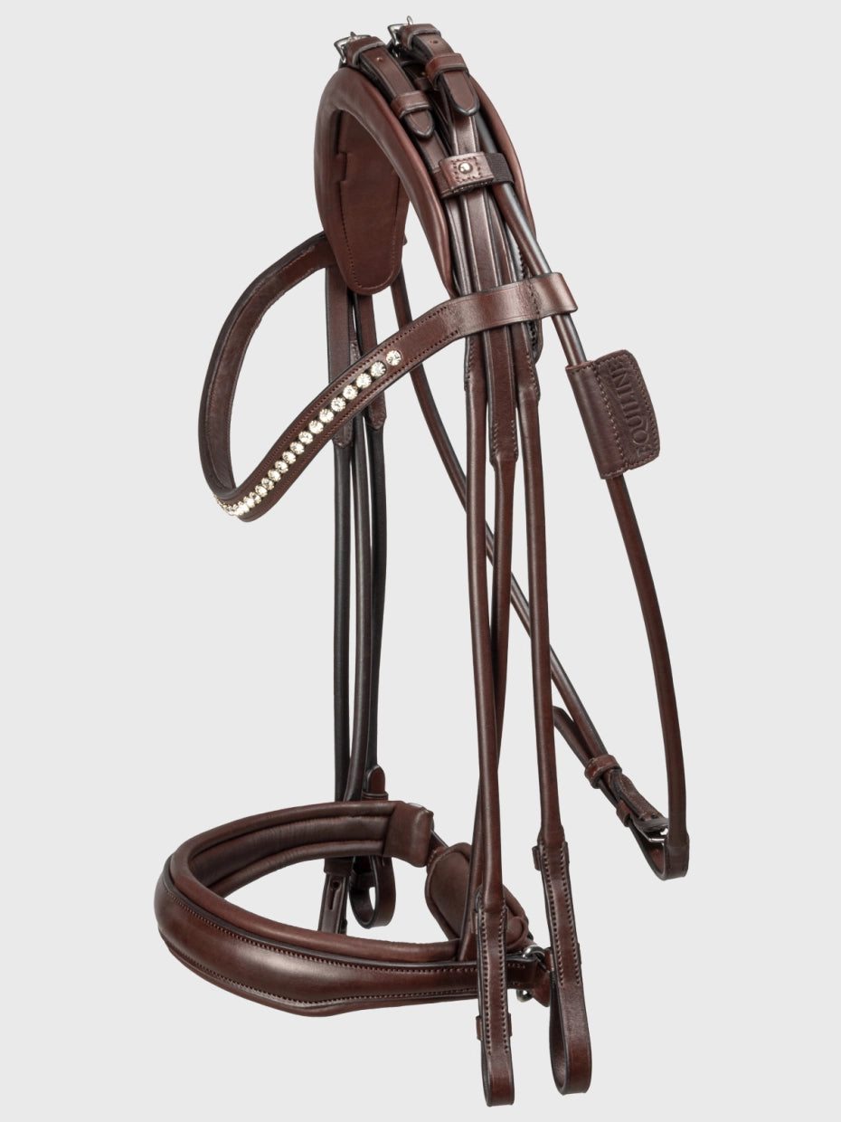 Testiera con montanti tubolari per morso e filetto. Copricapo modellato, foderato con imbottitura extra. I montanti tubolari di morso, filetto e sottogola convergono sulla nuca e vengono fissati facilmente grazie ai due anelli elastici per una migliore vestibilità e regolazione. Frontalino a forma di U con cristalli, passante doppia via per la suddivisione dei montanti. Nasalina pullback dalla forma morbida, rialzata e foderata con anelli a D in acciaio inox.