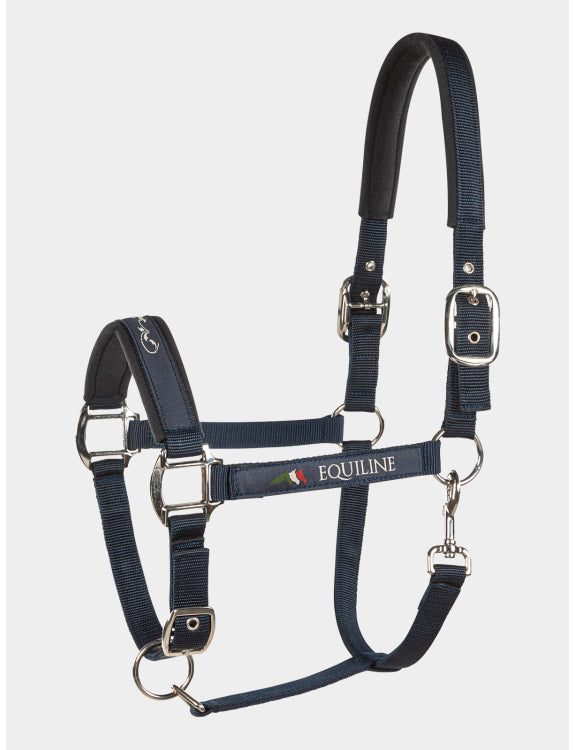 Capezza regolabile in polipropilene con morbida imbottitura in Neoprene. Moschettone e anelli in metallo satinato.