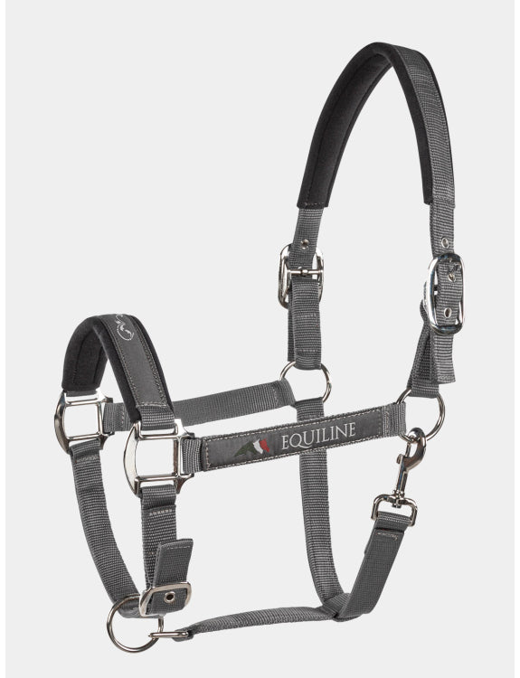 Capezza regolabile in polipropilene con morbida imbottitura in Neoprene. Moschettone e anelli in metallo satinato.