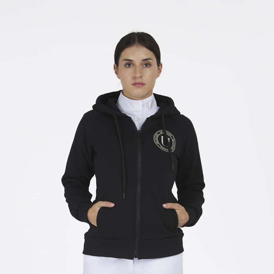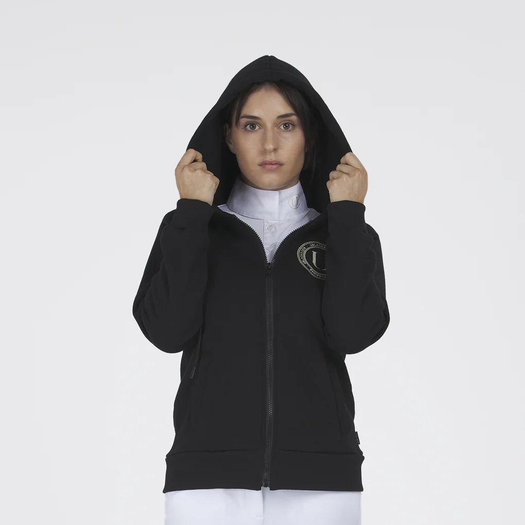 Felpa in cotone garzato con cappuccio e coulisse regolabile. Tasca a marsupio sul davanti e logo ricamato con filo color champagne a cuore. Realizzata in Italia.